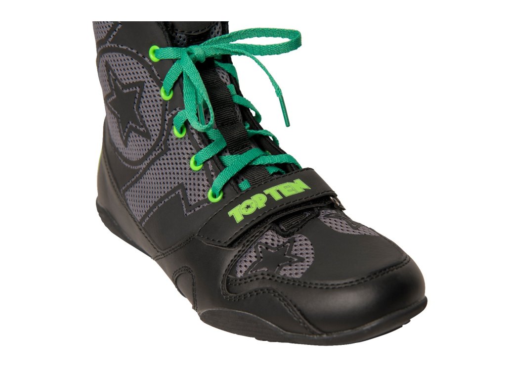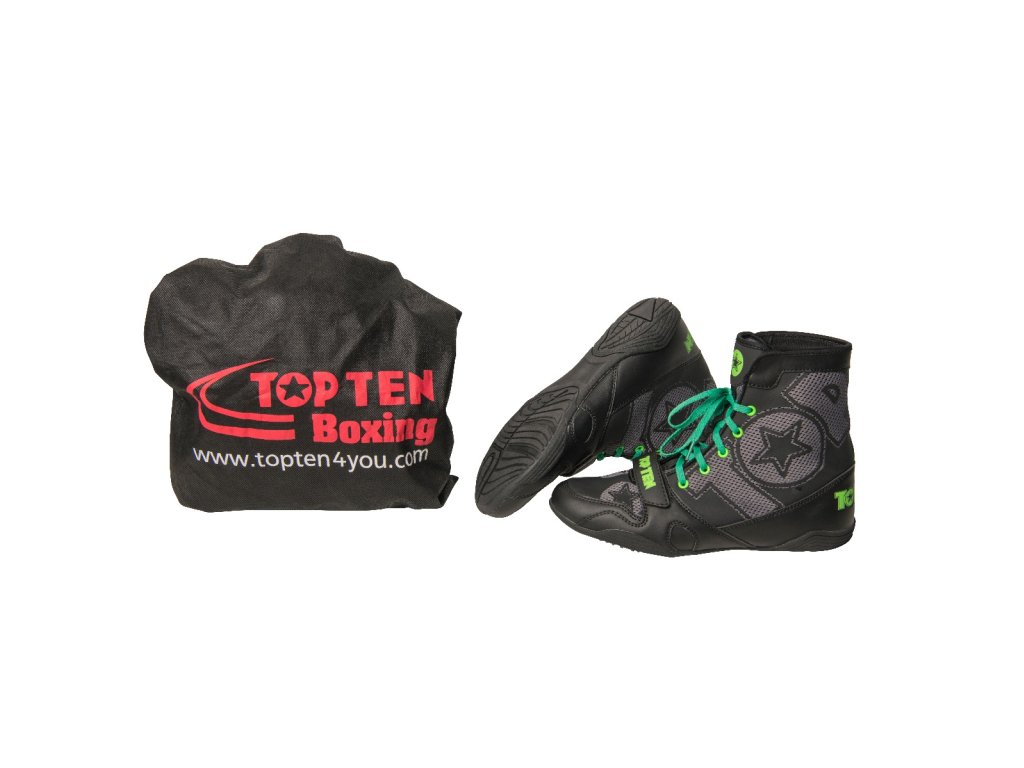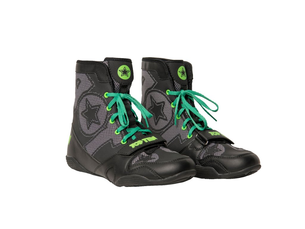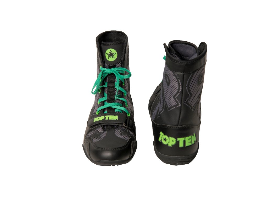Spoľahnite sa na know-how špecialistov TOP TEN a obujte si ľahké boxerské topánky "Black Star" v ringu aj na podložke. Ich dizajn sa dokonale prispôsobí meniacemu sa šatníku a vďaka dvom párom šnúrok (čiernej a zelenej) je s týmito športovými topánkami zaručená rozmanitosť. Na zabezpečenie odolnosti je použitá kvalitná syntetická koža so vzdušnou sieťovinou. Klíma "Black Star" je vždy príjemná bez toho, aby ste museli obetovať ochranu. Pre dobrý stoj a protišmykový vzhľad je podrážka boxerských topánok prispôsobená jedinečným potrebám boxu.