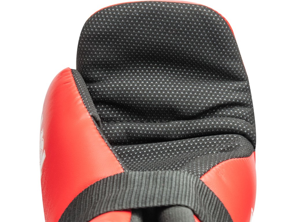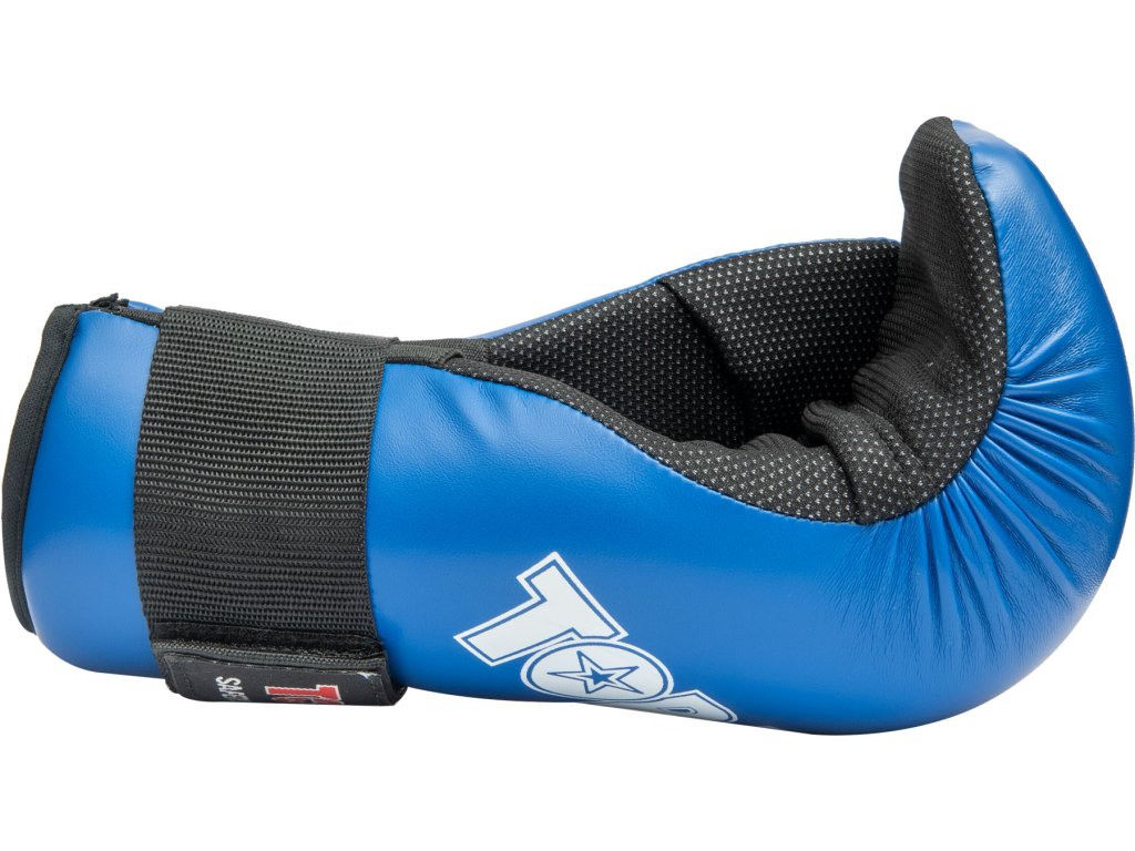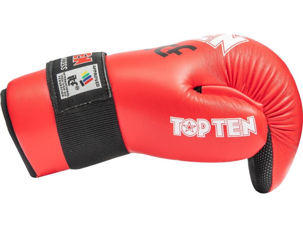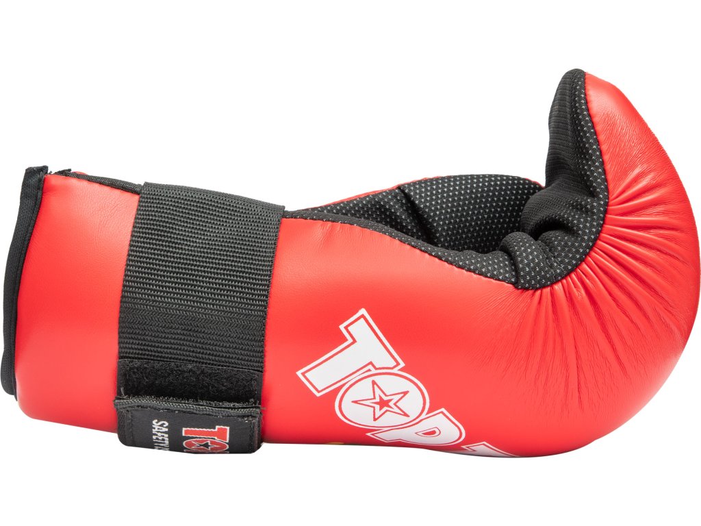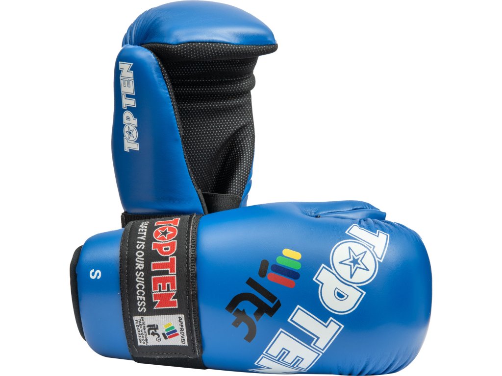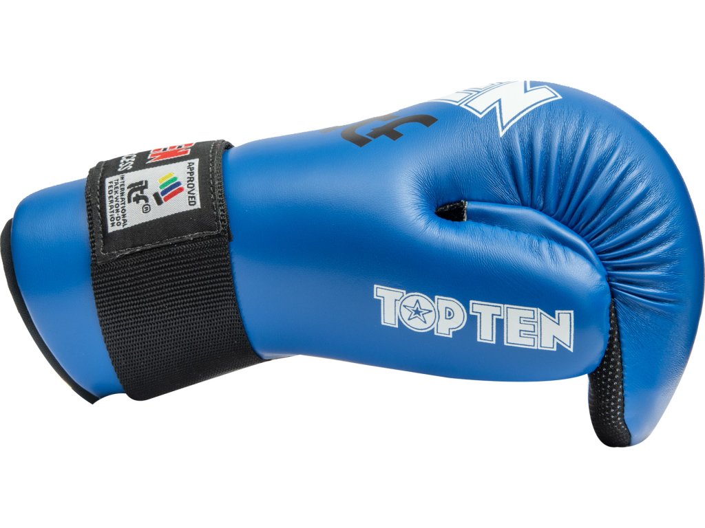 Schválený pre súťaže ITF v Taekwon-Do, Open Hands "ITF" je skutočným vrcholom od TOP TEN. Vďaka poťahu z odolnej umelej kože na vonkajšej strane a vnútornému materiálu šetrnému k pokožke je "ITF" úspešnou kombináciou funkčnosti a pohodlia pri nosení. Všitý palec zvyšuje bezpečnostný výkon, zatiaľ čo mimoriadne dlhý driek a pevný upínací pásik optimalizujú prispôsobenie otvorených rúk. Z hľadiska dizajnu vychádza TOP TEN zo známych súťažných farieb červenej a modrej pre otvorené ruky "ITF". Nápisy značky TOP TEN a motív ITF dodávajú rukaviciam nadčasový outfit so športovým charakterom.
