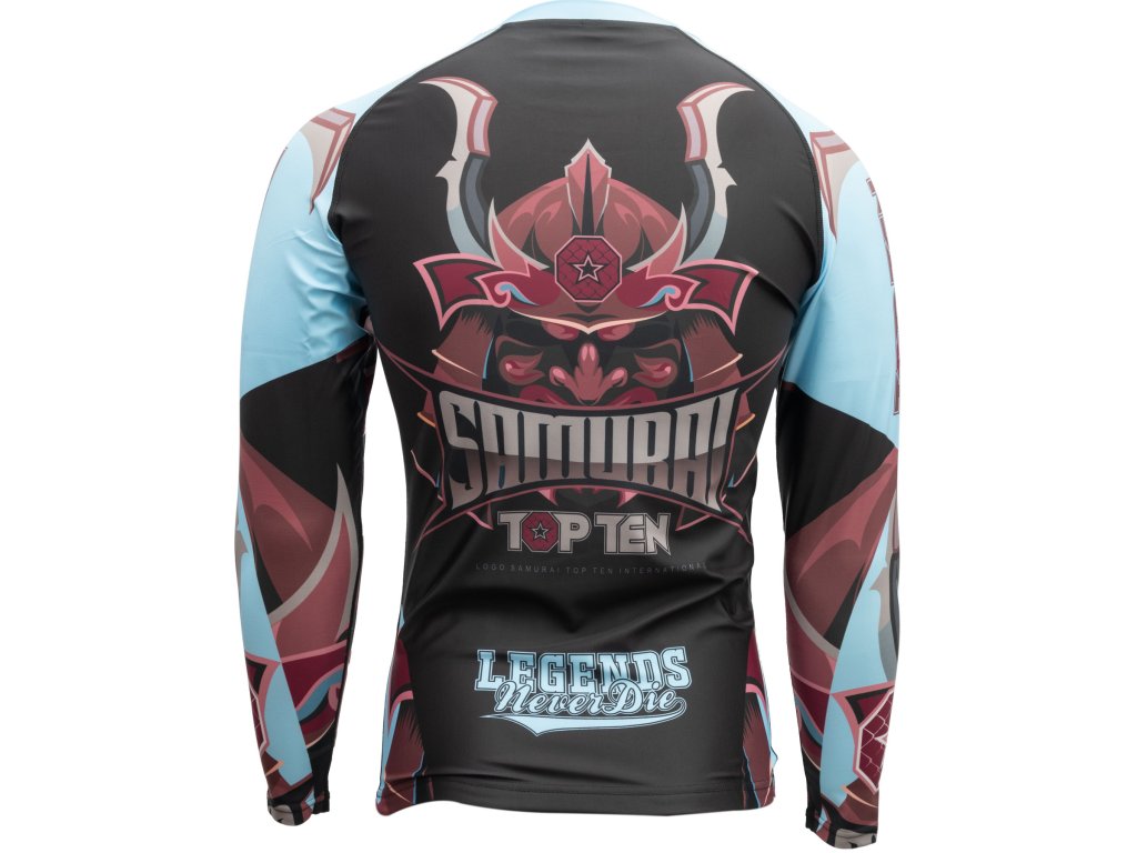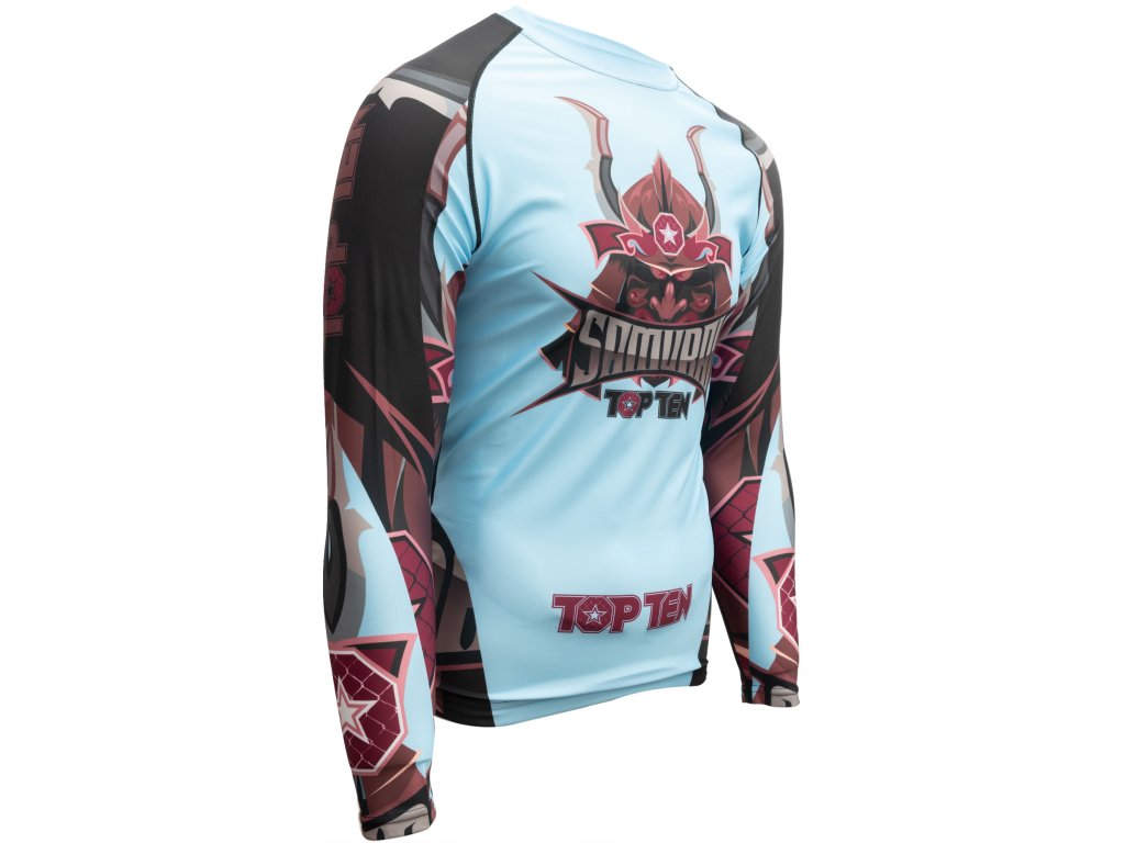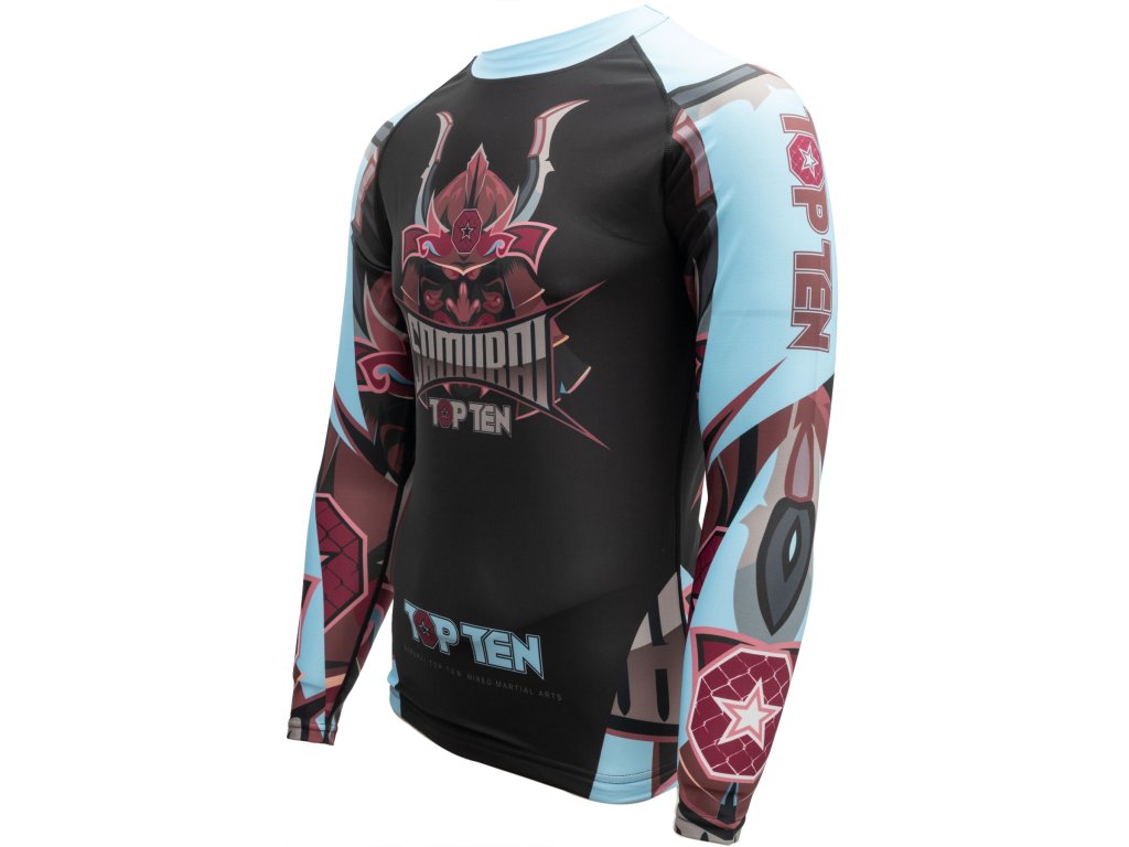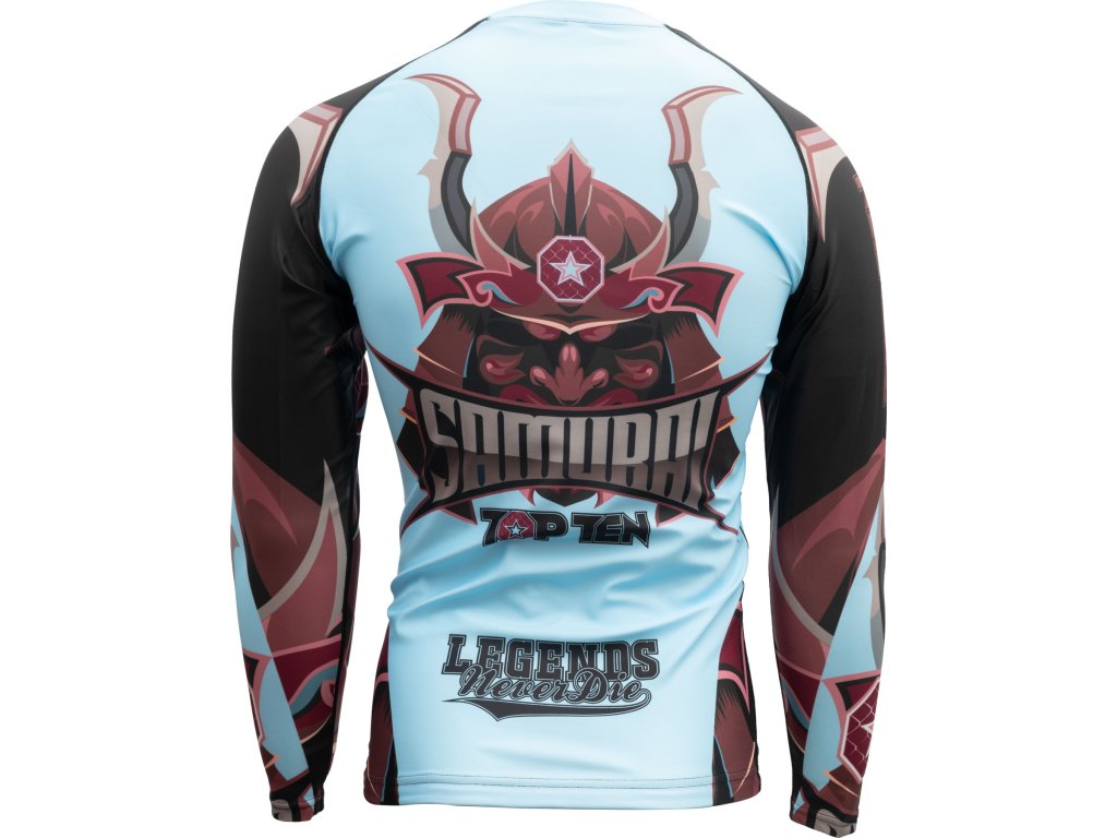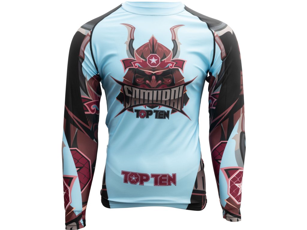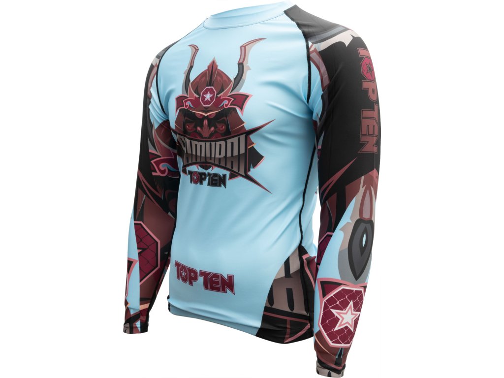 Toto tričko od spoločnosti TOP TEN patrí k novej elite vo vašom šatníku. Nie je to len dizajn, ktorý robí košeľu "Samurai" Rash Guard jedinečnou. Vďaka tkanine z vysoko výkonných funkčných vlákien kompresné tričko s dlhým rukávom podporuje vaše telo a aktivuje prácu svalov. Krv vo vašich žilách prúdi rýchlejšie, a tak sa do svalov dostáva viac kyslíka, ktoré pracujú efektívnejšie. Nemusíte sa ani veľa hýbať, aby ste pocítili výkonnosť trička "Samurai". Noste ho na optimalizáciu držania tela alebo si užívajte výrazne skrátený čas regenerácie vo výraznom tričku s dlhým rukávom od giganta v oblasti bojových umení TOP TEN.